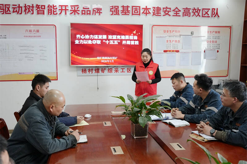 2月6日,杨村煤矿“百灵”宣讲队深入基层区队,开展了一场主题鲜明、内容扎实的形势任务教育宣讲活动。宣讲旨在引导全矿干部职工准确把握发展形势,统一思想认识,强化责任担当,为奋力夺取“十五五”开局首胜、推动矿井实现更高质量和可持续发展凝聚共识、注入动力。